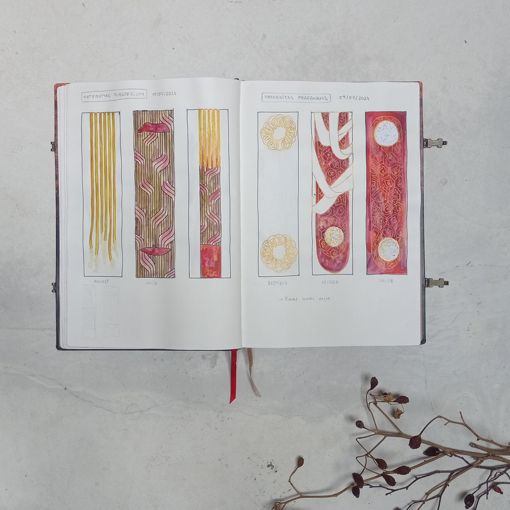 El procés creatiu s'inicia amb l'estudi de la idea del disseny. Es plasma el motiu sobre paper i es treballa fins a aconseguir un resultat satisfactori.