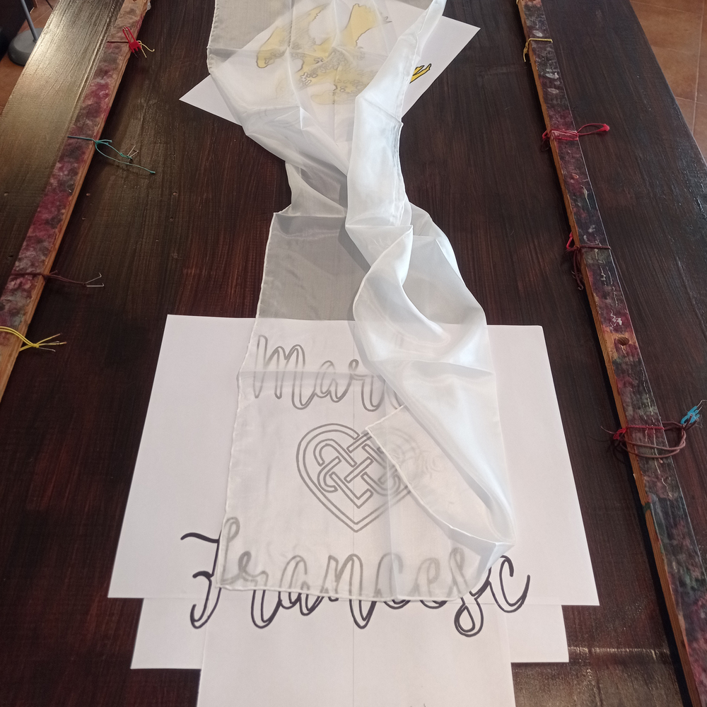 Amb la plantilla llesta i amb el disseny estudiat, preparem la seda. Amb delicadesa, es tensa la seda al bastidor i s'hi col·loca la plantilla a sota. Gràcies a la semitransparència de la seda, la creació del dibuix resulta molt més ràpid i segur.