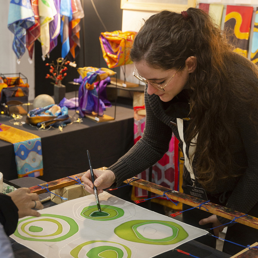 El procés de l'aplicació de la pintura és molt delicat i precís; és necessària la paciència i la concentració, ja que és un procés que no admet canvis ni rectificacions. Per això és tan important incloure en l'estudi del disseny la seva colorimetria, a fi d'aconseguir un resultat òptim. Foto de Xavi Padrós al Design Market BCN by FAD 2024.